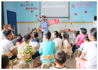 连日来,江西省遂川县公安局交管大队组织民警深入辖区乡镇,开展“牵好银发手 护好萌娃行”主题宣传教育活动,在寓教于乐中提升“一老一小”群体的交通安全意识和自我防护能力。图为8月13日,民警在泉江镇窗溪村讲解佩戴安全头盔的重要作用。 本报记者 黄辉 本报通讯员 肖遂冬 摄