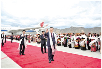 8月20日中午,中共中央总书记、国家主席、中央军委主席习近平率中央代表团乘专机抵达拉萨,出席西藏自治区成立60周年庆祝活动。这是习近平向欢迎群众挥手致意。