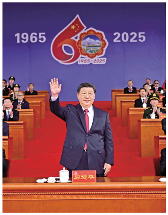 新华社拉萨8月21日电 六十载奋斗栉风沐雨,六十年雪域沧桑巨变。21日上午,西藏各族各界干部群众约2万人欢聚拉萨市布达拉宫广场,热烈庆祝西藏自治区成立60周年。中共中央总书记、国家主席、中央军委主席习近平出席庆祝大会。 中共中央政治局常委、全国政协主席、中央代表团团长王沪宁出席并讲话,中共中央政治局常委、中央办公厅主任蔡奇出席。 古城拉萨彩旗飘扬,处处洋溢着节日的氛围。雄伟的布达拉宫下,搭建起藏式风格的大会主席台。主席台上方中华人民共和国国徽和“西藏自治区成立60周年庆祝大会”横幅十分醒目,背景墙上悬挂着大庆会徽和“1965”“2025”字样,10面红旗分列两侧。主席台对面的布达拉宫广场上,身着节日盛装的各族群众从四面八方汇聚到这里,手中挥动着红旗,汇聚成一片欢乐的海洋。 上午10时许,在欢快的乐曲声中,习近平等领导同志走上主席台,全场响起长时间的热烈掌声。 西藏自治区党委副书记、自治区人民政府主席嘎玛泽登宣布大会开始。全场起立,高唱国歌,鲜艳的五星红旗在布达拉宫广场冉冉升起。 中共中央政治局委员、国务院副总理、中央代表团副团长张国清宣读中共中央、全国人大常委会、国务院、全国政协、中央军委关于庆祝西藏自治区成立60周年的贺电。(全文另发) 王沪宁向西藏自治区赠送习近平题词的“共建中华民族共同体 书写美丽西藏新篇章”贺匾。 王沪宁发表讲话。他说,1965年9月,在党中央亲切关怀和党的民族政策光辉照耀下,西藏自治区宣告成立。这是西藏发展史上具有划时代意义的大事,巩固了西藏和平解放和民主改革的伟大成果,实现了西藏社会制度的历史性跨越。60年来,西藏经济社会全面发展,民族区域自治制度成功实践,民族团结日益巩固,各族人民生活蒸蒸日上,充分展现了中国共产党领导的坚强力量,充分展现了我国社会主义制度的显著政治优势。 王沪宁表示,党的十八大以来,以习近平同志为核心的党中央高度重视、全面加强西藏工作,确立新时代党的治藏方略,从党和国家事业全局出发系统谋划推进西藏长治久安和高质量发展,西藏同全国一道打赢脱贫攻坚战、全面建成小康社会,西藏经济社会发展取得历史性成就,民族团结进步事业发生历史性变化,人民生活水平实现历史性跃升,西藏步入发展最好、变化最大、各族群众得实惠最多的历史时期,社会主义现代化新西藏建设展现勃勃生机。 王沪宁表示,站在新的历史起点上,我们要坚持以习近平新时代中国特色社会主义思想为指导,全面贯彻落实党的二十大和二十届二中、三中全会精神,深刻领悟“两个确立”的决定性意义,增强“四个意识”、坚定“四个自信”、做到“两个维护”,贯彻落实新时代党的治藏方略,牢牢把握铸牢中华民族共同体意识主线,抓好稳定、发展、生态、强边四件大事,努力建设团结富裕文明和谐美丽的社会主义现代化新西藏,为实现中华民族伟大复兴的中国梦不懈奋斗。(全文另发) 西藏自治区党委书记王君正、藏族群众代表卓玛仁增在会上发言。 随后,举行了充满吉祥喜庆气氛的盛大群众游行。游行分为“旗帜引领”“四件大事”“奋进新时代”“走向未来”4个单元,26个群众游行方队、彩车,在欢快的音乐中依次行进。各族群众身着绚丽多彩的服饰,跳起热情欢快的舞蹈,表达过上幸福生活的喜悦之情、对党和国家的感恩之情。习近平等不时向各界群众挥手致意。 在《歌唱祖国》的激昂旋律中,和平鸽展翅高飞,彩色气球腾空而起,现场响起热烈的掌声和欢呼声,大会圆满结束。 李干杰、何立峰、王小洪、洛桑江村、胡春华、帕巴拉·格列朗杰和张升民,在西藏工作过的老同志,以及中央和国家机关有关部门负责同志、中央代表团全体成员,西藏自治区党政军负责同志等出席大会。