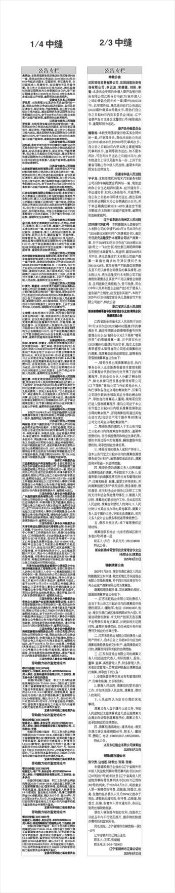 2/3中缝 仲裁公告 沈阳珺钰贸易有限公司、沈阳润玺投资咨询有限公司、李云波、宋德强、刘姝、李智:本委员会受理的申请人葫芦岛银行股份有限公司沈阳分行与你方(被申请人)之间的借款合同纠纷一案(葫仲[2022]38号),已审理终结。现依法向你们公告送达[2022]葫仲裁第38号裁决书。限你们自公告之日起60日内到本委员会(地址:辽宁省葫芦岛市龙港区龙警街11号)领取裁决书,逾期即视为送达。 葫芦岛仲裁委员会 魏敬杨:本院受理晏家俊诉你买卖合同纠纷一案,已审理终结,现依法向你公告送达(2025)皖0523民初2989号民事判决书。自公告之日起30日内来本院立案庭领取民事判决书,逾期即视为送达。如不服本判决,可在判决书送达之日起15日内,向本院递交上诉状及副本各一份,上诉于安徽省马鞍山市中级人民法院。逾期本判决即发生法律效力。 安徽省和县人民法院 宁子龙:本院受理杭州观禾汽车服务有限公司诉你车辆租赁合同纠纷一案,现依法向你公告送达起诉状副本、应诉通知书、举证通知书、权利义务告知书、开庭传票。自公告之日起30日即视为送达。提出答辩状和举证期限均为公告期满的15日内。并于举证期满后第3日8:40时(遇法定节假日顺延)在本院第三法庭开庭审理,逾期将依法缺席裁判。 辽宁省阜新市海州区人民法院 (2024)浙1126破3号 本院根据庆元县隆安竹木有限公司的申请于2024年11月26日作出“(2024)浙1126破申3号”《民事裁定书》,裁定受理庆元县隆安竹木有限公司破产清算一案,并于2024年12月30日作出“(2024)浙1126破3号之一”《决定书》指定浙江南明律师事务所担任本案管理人。现查明,截至2025年8月20日,庆元县隆安竹木有限公司破产清算一案裁定确认的无异议债权已有7861019.29元,其现有资产不能清偿到期债务且不足以清偿全部债务的事实清楚。故本院认为,庆元县隆安竹木有限公司不能清偿到期债务且其资产不足以清偿全部债务,且明显缺乏清偿能力,资不抵债,符合《中华人民共和国企业破产法》关于债务人宣告破产之规定,应当宣告其破产。本院于2025年8月20日裁定宣告庆元县隆安竹木有限公司破产。特此公告 浙江省庆元县人民法院 新余新鼎啃哥壹号投资管理合伙企业(有限合伙) 强制清算公告 江西省新余市渝水区人民法院于2025年7月18日作出(2025)赣0502强清2号民事裁定书,裁定受理新余新鼎啃哥壹号投资管理合伙企业(有限合伙)(以下简称“啃哥投资”)的强制清算一案,并于同日作出(2025)赣0502强清2号决定书,指定北京新鼎荣盛资本管理有限公司组成清算组进行清算。现清算组依照法律规定,就啃哥投资强制清算事宜公告如下: 一、啃哥投资出现清算事由后,执行事务合伙人北京新鼎荣盛资本管理有限公司根据合伙协议的约定开展了自行清算程序,并向全体合伙人分配了剩余财产,除北京紫马投资基金管理有限公司(以下简称“紫马公司”)外的其他合伙人均已领取各自应分得的剩余财产,仅紫马公司因失联尚未领取其应分得的剩余财产,导致自行清算陷入僵局。现啃哥投资已进入强制清算程序,紫马公司应于本公告刊登之日起45日内联系清算组领取应分得的剩余财产,否则清算组将通过其他合法方式(包括但不限于提存等)向紫马公司交付其应分得的剩余财产。 二、啃哥投资的债权人于本公告刊登之日起45日内向清算组申报债权。逾期申报债权的,自行承担费用和相应法律后果。债权申报过程中如有漏报、瞒报虚假申报债权的,将承担相应法律后果。 三、啃哥投资的债务人或财产持有人,自本公告刊登之日起10日内向清算组清偿债务或交付财产。逾期清偿或返还的,清算组将采取进一步法律措施。 四、啃哥投资的清算义务人应积极配合清算组进行清算,并承担如下义务:1、妥善保管并向清算组移交所占有和管理的财产、印章和账册、账簿、重要文件等资料,并向清算组提交财产状况说明、债务清册、债权清册、有关财务会计报告以及职工工资的支付和社会保险费用情况;2、根据人民法院、清算组的要求进行工作,并如实回答人民法院、清算组和债权人的询问;3、人民法院认为其应当办理的其他事项。清算义务人怠于履行义务,导致无法清算的,相关义务人应对企业债务承担连带清偿责任。 五、债权申报方式:线下邮寄债权证明材料。 清算组联系地址:北京市西城区新兴东巷15号5号楼一层 联系人:齐丹 联系方式:18511249088 特此公告。 新余新鼎啃哥壹号投资管理合伙企业 (有限合伙)清算组 2025年8月23日 强制清算公告 2025年7月28日,淮安市清江浦区人民法院根据倪卫东申请,裁定受理江苏东旺锆业有限公司强制清算,并于同日指定淮安市中冉企业破产清算有限公司为清算组。 清算组现依据法律、司法解释的规定,就强制清算事宜公告如下: 一、江苏东旺锆业有限公司的债权人应当于本公告之日起45日内向清算组申报债权(联系人:戴桂军,电话:13390816837,地址:淮安市清江浦区淮海南路65号六层),书面说明债权数额、有无财产担保及是否属于连带债权等有关事项,并提供相关证据材料。逾期申报债权的,自行承担补充申报费用及相应的法律后果。 二、江苏东旺锆业有限公司的债务人或财产持有人,自本公告之日起30日内应当向清算组清偿债务或交付财产。逾期清偿或交付的,清算组将采取相应的法律措施。 三、江苏东旺锆业有限公司的清算义
