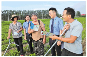 | 图为河南省尉氏县人民检察院驻点检察干警走访群众,发放公益诉讼宣传手册。 |