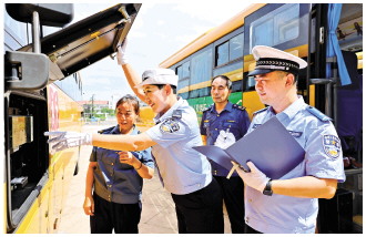 新学期开学临近,山东省枣庄市公安局市中分局交通管理大队在辖区组织开展校车安全专项检查,及时排除隐患,确保学生乘车安全。图为八月二十日,民警检查校车安全性能。