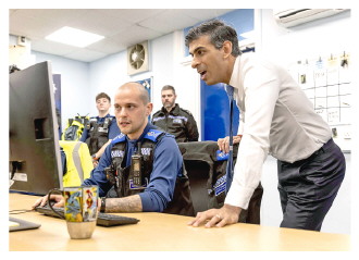 当地时间2024年4月10日,英国苏塞克斯郡,时任英国首相苏纳克在霍舍姆警察局观看监控录像,表示政府将遏制商店盗窃犯罪。 CFP供图 |