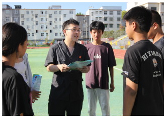 图② 8月24日,河南省方城县人民法院干警走入方城县第五高级中学军训新生中,开展“入学第一堂法治课”活动,通过举办法治讲座、发放法治宣传彩页、沟通交流等形式,提升新生法治意识。图为该院干警解答学生提出的法律问题。