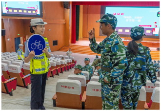 图① 秋季开学在即,江苏省滨海县公安局交警大队组织民辅警走进滨海县明达中学,为高一新生上好开学第一课。图为交警为学生讲解交通安全出行小常识。
