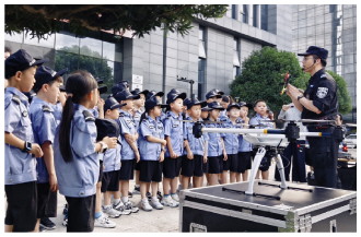近日,浙江省乐清市公安局举办第七届“快乐暑期 护航成长”夏令营,160余名少年儿童走进市公安局训练基地,开展安防知识学习、警体技能体验等丰富多彩的活动。图为民警向孩子们展示警用无人机。 本报记者 王春 本报通讯员 周展 摄