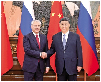 新华社北京8月26日电 记者冯歆然 8月26日上午,国家主席习近平在北京人民大会堂会见俄罗斯国家杜马主席沃洛金。 习近平指出,中俄关系是动荡变革的当今世界最稳定、最成熟、最富战略内涵的一组大国关系。持之以恒推动中俄关系高水平发展,符合两国人民根本利益,也是世界和平的稳定源。今年5月,我对俄罗斯进行国事访问并出席纪念苏联伟大卫国战争胜利80周年庆典,下周中方将隆重举行纪念中国人民抗日战争暨世界反法西斯战争胜利80周年活动。中国和苏联分别作为第二次世界大战亚洲和欧洲主战场,为抗击日本军国主义和德国法西斯侵略付出巨大民族牺牲,为赢得二战胜利作出重大贡献。双方要赓续传统友谊,深化战略互信,加强各领域交流合作,携手捍卫两国安全和发展利益,团结全球南方国家,坚持真正的多边主义,推动国际秩序朝着更加公正合理的方向发展。 习近平强调,立法机构合作是中俄新时代全面战略协作伙伴关系不可或缺的组成部分。希望双方积极开展治国理政和立法经验交流,为新形势下中俄战略协作和各领域合作提供更加坚实的立法保障。 沃洛金转达普京总统对习近平主席的亲切问候和良好祝愿。沃洛金说,在两国元首战略引领下,俄中关系深入发展,卓有成效。俄国家杜马致力于落实两国元首重要共识,加强俄中立法机构交流合作,全力以赴推动两国关系取得更多成果。80年前,苏联和中国人民为战胜法西斯作出重大贡献。俄方愿同中方共同庆祝这一来之不易的胜利,缅怀先烈,携手开创美好未来。 王毅、彭清华参加会见。