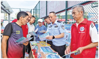 近日,在江西省宜春市袁州区美丽乡村篮球联赛总决赛的赛场外,袁州区禁毒办与区教体局联合开展“无毒赛场”普法宣传,营造全民禁毒良好氛围。图为民警与禁毒志愿者向群众讲解禁毒知识。 本报记者 黄辉 本报通讯员 熊思炜 摄