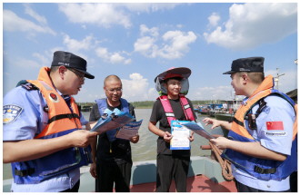 南京港边检站近日联合长江航运公安局南京分局栖霞派出所、江苏省南京市公安局南京经济技术开发区分局新港派出所等协作单位,在长江南京段新生圩港区水域开展“党建引领聚共识 联勤联动保平安”为主题的专项执法行动。图为民警向船方负责人发放反诈宣传单。 本报通讯员 章善玉 摄