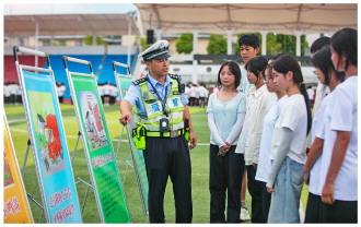 近日,江西省横峰县公安局交通管理大队组织民辅警走进辖区学校,通过案例警示、游戏互动、现场答疑等方式,为学生们上好交通安全“开学第一课”,全力守护青少年安全出行。图为民警走进横峰县职业中学向学生们宣传交通安全法律法规。 本报记者 黄辉 本报通讯员 薛南 摄