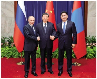 九月二日上午,国家主席习近平同俄罗斯总统普京、蒙古国总统呼日勒苏赫在北京人民大会堂举行中俄蒙三国元首第七次会晤。