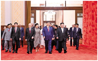 在喜庆欢乐的乐曲声中,习近平同中外嘉宾一起举杯,共同庆祝中国人民抗日战争和世界反法西斯战争的伟大胜利,共同祝愿世界和平。 招待会上,习近平和彭丽媛同贵宾们观看主题为《以史为鉴 共创未来》的文艺演出。 来华出席中国人民抗日战争暨世界反法西斯战争胜利80周年纪念活动的外国领导人及有关国家高级别代表、国际组织负责人、前政要,各国驻华使节、武官和国际组织驻华代表,为中国抗战胜利作出贡献的国际友人或其遗属代表出席招待会。 出席招待会的还有:中共中央政治局委员、中央书记处书记,全国人大常委会、国务院、全国政协、中央军委有关领导同志,香港特别行政区行政长官、澳门特别行政区行政长官。 中央党政军群有关部门和北京市主要负责同志,参加过抗战的老战士、老同志,抗战烈士亲属代表,国民党抗日老兵代表,海内外爱国人士、抗战将领遗属代表,各民主党派中央、全国工商联主要负责人和无党派人士代表,功勋荣誉获得者代表,港澳台同胞、海外侨胞代表等也出席招待会。