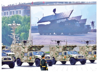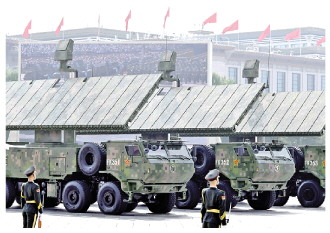 有剑指苍穹、御敌长空的对空抗击方队。英雄的地空导弹部队曾创造防空作战辉煌战绩,红旗-20、红旗-19、红旗-29等6种新型装备亮相天安门广场,可实施多段多层反导拦截、远中近程防空抗击,构筑起防空御天的坚固屏障,守护祖国天空和平安宁。