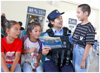 图① 阿克苏站派出所民警在候车室自助充电桩前对正在给手机充电的旅客进行安全提醒。 图② 阿克苏站派出所民警在候车室向青少年开展普法宣传。
