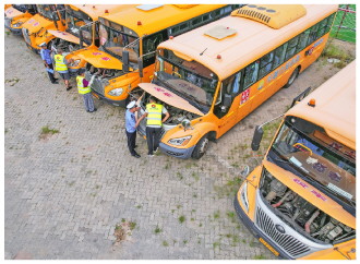 近日,山东省青岛市公安局交通管理支队李沧区大队民警联合区教体局工作人员对全区15家校车企业79辆校车进行专项安全检查,及时排除安全隐患。图为民警对校车车况进行检查。 本报通讯员 张鹰 摄