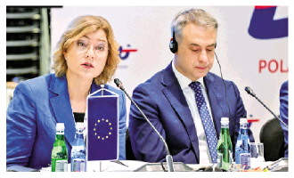 | 欧盟委员会负责技术主权等事务的执行副主席汉娜·维尔库宁(左)9月1日强调,欧盟将继续执行数字立法。 CFP供图