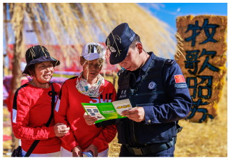 近日,新疆出入境边防检查总站伊犁边境管理支队察汗乌苏边境派出所组建“普法小分队”,将防范电信网络诈骗和秋季防火知识送到辖区村民和游客身边。图为民警在为游客讲解防范电信诈骗常识。 本报记者 潘从武 本报通讯员 王鹏飞 邓宇 摄