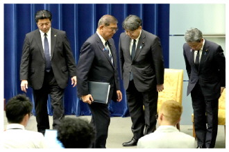 | 图为当地时间2025年9月7日,日本首相石破茂(左二)在首相官邸举行新闻发布会后离开。 CFP供图 |