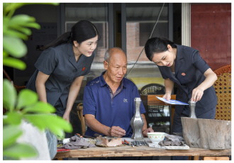 ▲ 福建省连城县的四堡锡器制作技艺是省级非物质文化遗产。近日,连城县人民法院法官走进四堡镇开展非遗保护精准普法活动。图为法官向锡器制作技艺非遗传承人宣讲订单履约、非遗维权等方面的法律知识。 本报记者 王莹 本报通讯员 钟秋金 李玲 摄