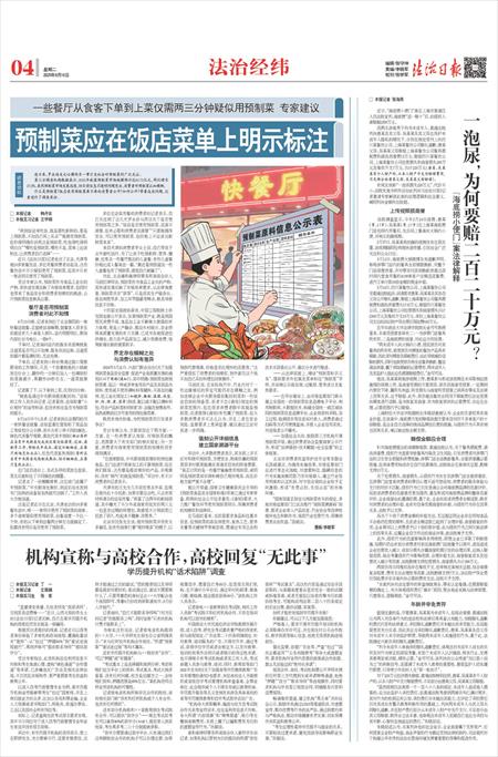 近日,《法治日报》记者走访了北京、天津等地10多家餐饮店,多位用餐消费者如是说。这些餐饮店中不少疑似使用了预制菜,但其中只有一家店明示使用了预制菜。