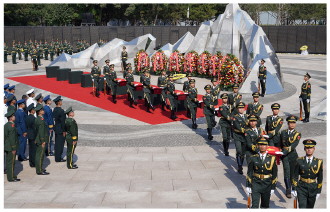 图为9月13日,礼兵护送志愿军烈士棺椁进入沈阳抗美援朝烈士陵园安葬地宫。