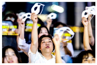 | 图为当地时间2024年8月30日,韩国首尔,抗议者举行示威,反对深度伪造色情片,活动人士佩戴面具。 CFP供图 |
