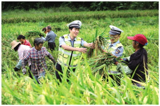当前正值秋收农忙季节,安徽省舒城县公安局交管大队联合张母桥派出所走进辖区冒峰村田间地头,把安全知识送到村民身边。图为民辅警与村民一起劳动并普及交通安全知识。 本报通讯员 王可海 摄