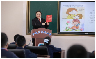 9月22日,黑龙江省伊春市中级人民法院干警走进伊春市伊美区实验小学,开展“法润林都 守护童心”送法进校园主题活动,为孩子们送上一堂生动有趣的法治启蒙课。图为法官向学生讲解民法典知识。 本报记者 张冲 本报通讯员 郭美琳 摄