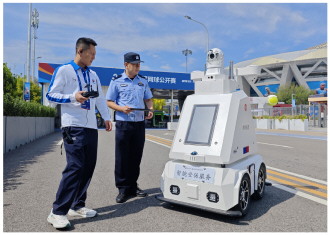 ▲ 2025中国网球公开赛于9月14日至10月5日在国家网球中心举行。北京警方联合相关单位,按照“一馆一策”标准实地踏勘,制定全方位安保方案。图为民警和场馆工作人员在园区调试安保机器人。 本报记者 张雪泓 本报通讯员 李连杰 摄