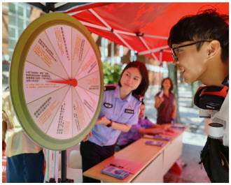 近日,浙江省宁波市公安局鄞州区分局邱隘派出所组织民警走进浙江万里学院,开展反诈普法宣传活动。民警通过将刷单诈骗、冒充客服、网络交友骗局等高频诈骗类型融入到趣味答题中,让学生在参与中掌握防骗技巧。图为民警用“反诈知识转盘”普及反诈知识。