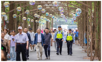 国庆中秋假期,位于上海市崇明区建设镇的东平国家森林公园迎来客流高峰。上海市公安局崇明分局建设派出所民辅警坚守一线,开展人流疏导、服务群众等工作,确保游客平安出行。图为节日期间民警在森林公园内巡逻。 本报通讯员 沈群 施大为 摄
