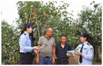 近日,安徽省砀山县万亩梨园迎来“采摘节”。砀山县公安局组织民辅警深入果园开展治安巡逻、反诈宣传、服务群众等工作,帮助果农解决实际问题。图为民警向果农宣传反诈知识。 本报通讯员 张广星 摄