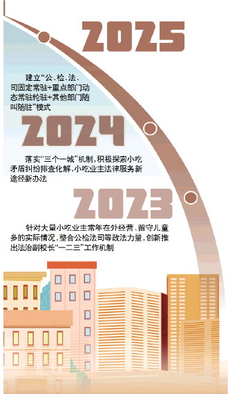 一碗拌面、一勺扁肉(馄饨),让“沙县小吃”成为享誉全国的美食符号。而在这张美食名片背后,是一场持续多年的平安建设探索。 从2023年的法治副校长机制守护留守儿童,到2024年的“舌尖枫桥”护航小吃产业,再到2025年的“综治中心”一站式解纷,三年间,法治的力量如静水流深,在沙溪河畔悄然夯实着这座“小吃之乡”的平安基底,也让老百姓的获得感、幸福感、安全感更加充实。 2023年以来 守护留守儿童成长 “现在我能靠手艺养活自己,还能参加义工活动帮助别人。” 2025年2月,一名曾沉迷游戏、多次离家出走的“问题少年”王浩(化名)给曾经帮扶过他的法治副校长、福建省三明市沙县区人民检察院检察官陈茂青发来了微信。字里行间满是他对生活的热爱。 2023年以来,沙县区针对大量小吃业主常年在外经营、留守儿童多的实际情况,整合公检法司等政法力量,创新推出法治副校长“一二三”工作机制,减少小吃业主后顾之忧。 沙县区委政法委副书记戴泉强近日向《法治日报》记者详细解释了“一二三”分别代表什么。 “一”指的是“区管、局聘、校用”管理模式,由区委政法委总协调,学校、选派机关、区教育局形成“三位一体”评价体系,确保工作有人管、有人抓、有实效。“二”是两项核心坚持:坚持维护学生合法权益、坚持未成年人零犯罪目标。“三”是指法治副校长的三重身份定位:传播法律知识的“教师”、参与校园治理的“校领导”、提供专业支持的“专家”。 “面对不同年龄段的留守儿童,法治副校长各展所长,编织起一张大大的平安守护网。”戴泉强表示。 法治副校长“一二三”工作机制运行以来,沙县区共选聘法治副校长84名,累计出勤1671人次,总时长3492.41小时。其中,有11名辍学未成年人被成功劝返校园。 “通过‘警网融合’‘家校共育’等模式带动,部分未成年人家长化身微网格长反哺社会,校园周边商铺、居民也主动加入‘安全防范网’,形成全民护校的良好氛围,全区未成年人刑事案发数及涉案人数总体呈下降趋势,给在外打拼的小吃业主们吃下一颗‘定心丸’。”沙县区教育局党组成员舒登科说。 2024年以来 护航小吃产业发展 老刘是一家沙县小吃店的老板,2024年的一天,他的一张银行卡被法院冻结了,焦急万分的他拨通了三明市沙县区人民法院的电话。没想到,仅用三天时间,问题就圆满解决了。此后,每当他看到小吃业主群里有人讲述自己的烦心事,他都会特别热心地告诉对方:“家乡的政法机关针对‘欺行霸市’‘商标侵权’‘劳资纠纷’等小吃业主常见的烦心事提供远程法律咨询、云调解、法院‘异步调审’等服务,可方便啦!” 沙县小吃不仅是一张美食名片,更是当地经济的重要支柱。目前,沙县小吃门店已增至8.8万家,年营业额突破550亿元,辐射全球79个国家和地区,带动就业人口30余万人。然而,随着产业蓬勃发展,小吃业主面临的法律问题也日益增多,商标侵权、劳资纠纷、合同问题等不断涌现。 为破解难题,三明市、沙县区两级政法机关在沙县小吃同业公会驻外联络处分布的33个城市,落实“三个一城”机制(一城一民警、一城一法官、一城一律师),积极探索小吃矛盾纠纷排查化解、小吃业主法律服务新途径新办法,着力打造“舌尖枫桥”工作法。 自“舌尖枫桥”工作法实施以来,政法机关共化解涉小吃矛盾纠纷2000多起,为小吃业主提供各类法律服务和法律帮助9000余人次。 三明法务区位于沙县区与三元区的连接带,这里汇聚了律师事务所、公证机构、司法鉴定机构等优质法务机构和专业人才,法院、检察院、仲裁委、律师协会也有相关机构入驻其中,形成了全方位、多层次的法律服务矩阵。 “当小吃业主遇到复杂的知识产权纠纷或者跨区域的经济合同争议等疑难法律问题时,三明法务区内的专业团队能够迅速介入,凭借其丰富的经验和专业优势,为小吃业主提供精准的法律解决方案,助力小吃产业在法治轨道上稳健前行。”三明市法学会秘书科负责人姚璐介绍说。 2025年以来 解决群众急难愁盼 今年5月,沙县区夏茂镇长阜村村民小陈情绪激动地来到沙县区综治中心反映情况:“城乡供水一体化项目通水后水压过大,导致水塔溢水,造成我家房屋家具等损坏,80多岁的外婆因漏水问题无家可归,这事儿怎么解决?” 面对小陈的诉求,接访人员按照“初信初访即刻办理”要求,由入驻中心的区信访局联合城乡供水一体化项目指挥部、水务公司和专家调解员等多方力量开展实地勘测,并通过“背对背”协调、当面质证调解等方式,耐心细致地与小陈沟通协商。最终,项目施工方与小陈成功签订了调解协议,赔偿金及时支付到位,困扰小陈的难题得到圆满解决。 针对群众办事“多头跑”、调解力量分散、处置效率不高等难题,沙县区创新推动区信访局整建制入驻区综治中心,建立“公、检、法、司固定常驻+重点部门动态常驻轮驻+其他部门随叫随驻”模式,内嵌法学会工作站、速裁法庭、金牌调解室、心理咨询室、公共法律服务等6类专业调处服务模块,实现访、调、诉、裁、询的物理聚合与功能耦合,有效提升了综合治理效能。 2025年春节前夕,15名工人和业主焦急地来到沙县区综治中心,就某开发企业拖欠工程款及业主代办费的问题寻求帮助。 在区综治中心的协调下,法院、司法局、人社局等部门工作人员齐聚指