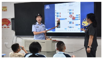 ▲ 近日,福建省寿宁县公安局下党派出所民警联合寿宁县人民法院法官来到辖区学校,通过以案说法、游戏互动、趣味问答等方式,向师生开展普法宣传。图为民警和法官为学生讲解防范电信诈骗知识。 本报通讯员 何瑞玉 摄
