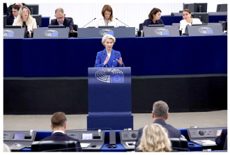 图为当地时间10月8日,法国斯特拉斯堡,欧盟委员会主席冯德莱恩在欧洲议会发言时谈及构筑“无人机墙”相关问题。