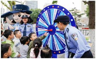▲ 10月11日,山东省青岛市公安机关举行食品安全宣传周启动仪式,现场通过设置宣传展板、发放宣传资料等形式,向群众普及食品安全法律法规知识。图为民警通过趣味转盘向小朋友宣讲食品安全知识。 本报记者 梁平妮 本报通讯员 吴昊 摄