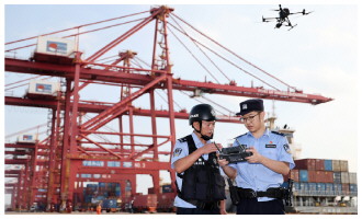 10月13日,浙江省舟山市公安局定海区分局联合舟山边检站走进辖区金塘港区大浦口集装箱码头,开展港区海域联合巡查、安全隐患排查等工作,全力护航港区安全生产。图为民警在港区开展无人机空中巡查。 本报通讯员 邹训永 高印 摄