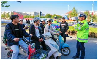 图① 近日,新疆维吾尔自治区温宿县公安局交通管理大队组织民警深入辖区各学校周边,开展“一盔一带”安全守护主题宣传活动,全力营造安全、有序、畅通的校园周边交通环境。图为10月16日,民警向新疆理工学院学生普及文明骑车相关知识。 本报记者 潘从武 本报通讯员 沈丹 刘新梅 摄