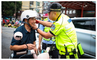 图② 近日,江西省宜丰县公安局交管大队组织民辅警深入辖区早市,开展以“戴好头盔、安全出行”为主题的宣传劝导活动,提升群众安全出行意识。图为民警为群众戴好头盔。 本报记者 黄辉 本报通讯员 敖燕平 摄