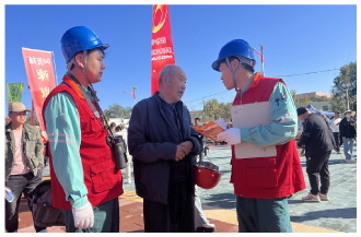近日,国网沙湾市供电公司组织共产党员服务队,深入农村、社区、企业,开展普法宣传活动。图为服务队队员在新疆维吾尔自治区沙湾市安集海镇文化广场,向村民讲解安全用电和电力设施保护知识。 栗兰欣 摄