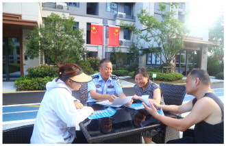 近日,浙江省宁波市公安局鄞州分局姜山派出所民警走进辖区潮起云悦府小区,向社区居民宣传防范电信网络诈骗知识,通过发放宣传册等形式,不断提高居民反诈意识。图为民警向居民讲解常见诈骗手段。