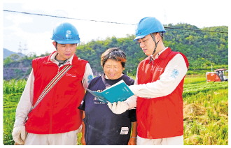 ▲ 连日来,国网浙江电力(遂昌)红船共产党员服务队走进田间地头,开展安全用电和保护电力设施宣传活动。图为服务队队员向农户讲解秋收期间用电注意事项。 祝灵潇 摄