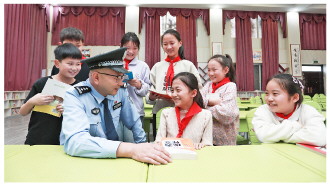 近日,江苏省邳州市公安局邢楼派出所组织民警深入辖区学校开展以校园安全为主题的法治宣传活动。图为民警在为学生讲解常见的校园霸凌应对方法。