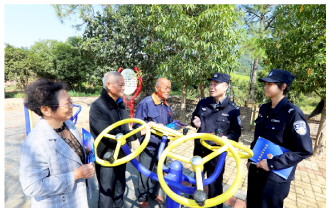 重阳节来临之际,连日来,江西省分宜县公安局组织民警开展“防范养老诈骗 守护幸福晚年”主题普法宣传活动。图为10月27日,民警在社区健身场所向老年人讲解防诈知识。