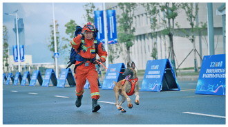 10月28日,国家综合性消防救援队伍第八届消防搜救犬技术比武竞赛在国家西南区域应急救援中心圆满落下帷幕。本次比武竞赛由国家消防救援局主办,国家西南区域应急救援中心承办,来自全国消防救援队伍的41支代表队、410名训导员携328头搜救犬齐聚四川成都,在单犬服从、箱体搜救、野外搜救、废墟搜救4个项目中展开激烈角逐。图为消防队员引导搜救犬在竞赛跑道上奋力奔跑。 本报通讯员 刘根森 摄