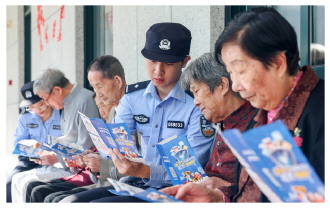 近日,浙江省岱山县公安局岱东派出所民辅警走进岱山县广华医院颐养院开展防范电信网络诈骗宣传,进一步提高老年人防骗意识。图为民辅警教老年人如何预防常见诈骗陷阱。