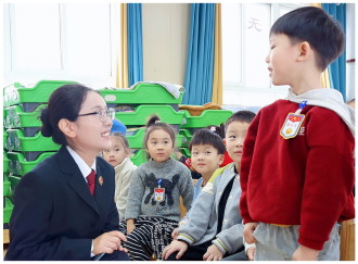 ▲ 近日,江苏省徐州市鼓楼区人民检察院检察官走进鼓楼区实验幼儿园,通过趣味问答、“过家家”等形式,与小朋友们做起防拐骗、守私密、保安全系列自我保护游戏,在寓教于乐中以法治温暖护航童年成长。图为检察官倾听小朋友对自我保护游戏的认识。 本报记者 罗莎莎 本报通讯员 金磊 李雅婷 摄