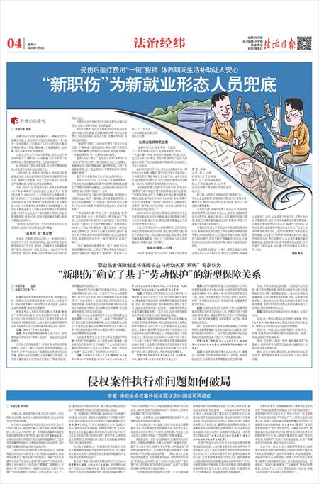 新就业形态人员职业伤害保障(以下简称“新职伤”)有哪些现实意义?未来该在哪些方面进一步完善?对此,《法治日报》记者采访了首都经济贸易大学劳动经济学院教授范围、北京市竞天公诚律师事务所合伙人赵骁和北京兰台律师事务所高级合伙人程阳。