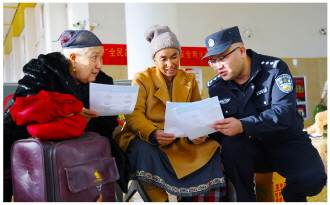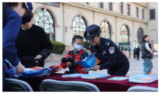 图② 11月7日,青岛铁路公安处特警支队联合青岛站派出所、青岛消防支队市南大队在青岛站广场开展消防安全知识普及宣传活动。图为民警向候车旅客讲解消防安全常识。 本报记者 梁平妮 本报通讯员 辛慰 摄