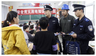图③ 11月7日,河南省洛阳市汝阳县公安局联合多部门开展“安全用火用电知识进校园”消防安全宣讲活动,通过实物展示、方法讲解、专业答疑等形式,提升学生应急避险与自救互救能力。图为民辅警向学生讲解安全用电知识。 本报通讯员 康红军 摄